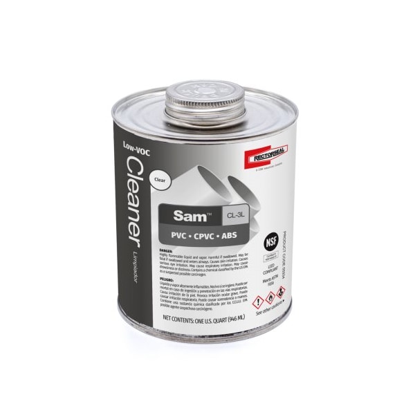 Sam CL-3L is a clear cleaner for use on all PVC, CPVC and ABS pipe, tubing, and socket-type fittings. Max VOC per SCAQMD 1168/316A or BAAQMD Method 40: 550 g/l.
