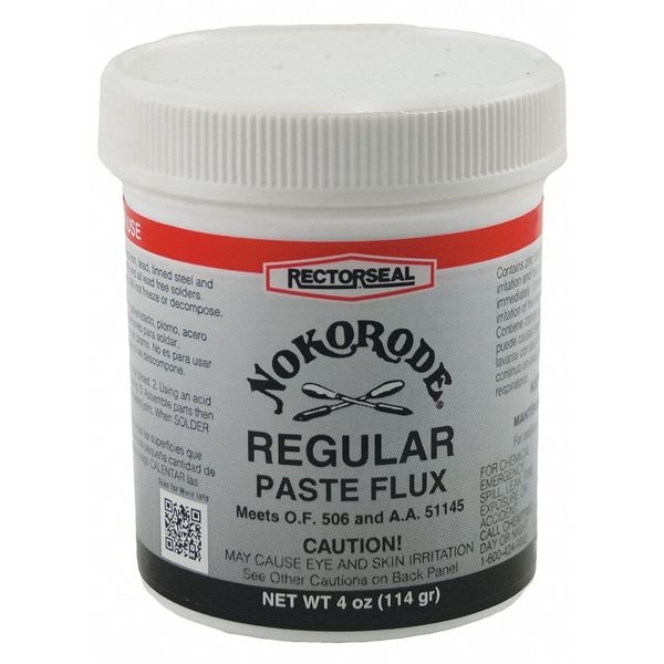 Soldering Flux, Container Capacity 4 oz, Container Type Jar, Form Paste, Maximum Active Temperature 400 Degrees F, Flux Series Nokorode, Flux Type Petroleum-Based, For Material Type Brass, Copper, Nickel, Tin, Zinc, For Solder Type Lead Free, Leaded, Tin/Lead, Standards A-A-51145, MIL-F-4995-2, NSF/ANSI 61-G, O-F-506, Type 1A, Application Plumbing, Potable Water, Features Cleans and Fluxes at the Same Time, Special Oil Base Protects Solder Against Corrosive Attack, Lead Content Lead-Free