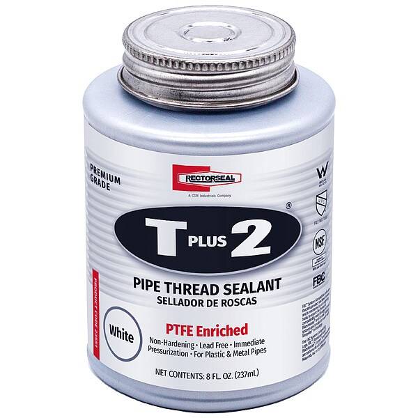 Pipe Thread Sealant, Cure Type Non-Hardening, Series T Plus 2, Container Size 8 fl oz, Container Type Brush-Top Can, Maximum Operating Temperature 350 Degrees F, Minimum Operating Temperature -15 Degrees F, Maximum Operating Pressure for Gases 2,000 psi, Maximum Operating Pressure for Liquids 10,000 psi, Color White, For Fluid Type Air, Kerosene, Petroleum Gas, Natural Gas, Propane, Water