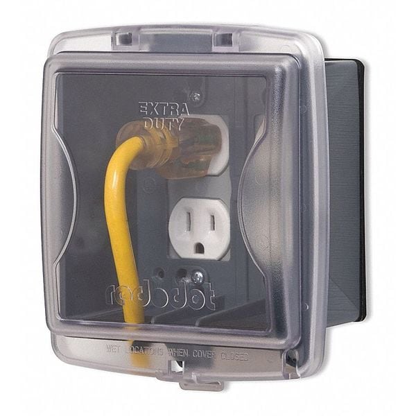 While In Use Weatherproof Cover, Body Material PVC, Mounting Orientation Vertical, Receptacle Type Duplex, Decora/GFCI Receptacle, Toggle Switch and Single Receptacle, Depth 3 23/64 in, Number of Gangs 2, Width 5 9/16 in, Height 6 5/8 in, Features Extra-Duty, Padlockable, Inside Depth 2 1/4 in, Color Clear, Standards NEC(R) Section 406.9 (B) (1) and 590.4 (D) (2) for Extra-Duty Outlet Box Hoods, Includes Instruction Sheet, Adapter Plates, Gasket, and Mounting Hardware