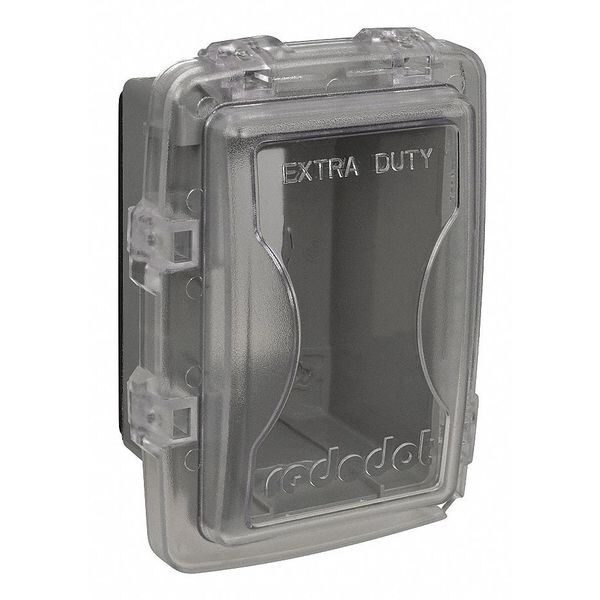 While In Use Weatherproof Cover, Body Material PVC, Mounting Orientation Horizontal or Vertical, Receptacle Type Duplex, Decora/GFCI Receptacle, Toggle Switch and Single Receptacle, Depth 2 5/8 in, Number of Gangs 1, Width 4 11/16 in, Height 6 5/32 in, Features Extra-Duty, Padlockable, Inside Depth 2 1/4 in, Color Clear, Standards NEC(R) Section 406.9 (B) (1) and 590.4 (D) (2) for Extra-Duty Outlet Box Hoods, Includes Instruction Sheet, Adapter Plates, Gasket, and Mounting Hardware