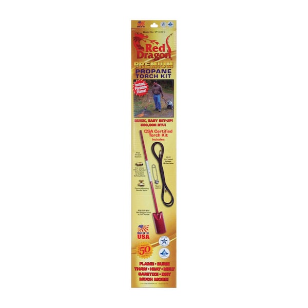 This is the original Red Dragon Torch Kit and continues to be the most popular premium torch kit in North America. This 500,000 BTU/ hr torch is our most powerful vapor torch and can handle the toughest jobs all year long. A great overall utility torch for years and years of service. Perfect for Farm and Ranch, Construction, Road Crews, Grounds Maintenance, Industry and More. Runs on tank pressure. No regulator required. The torch has a 3 in. diameter bell and a total length of 33 1/2 in.