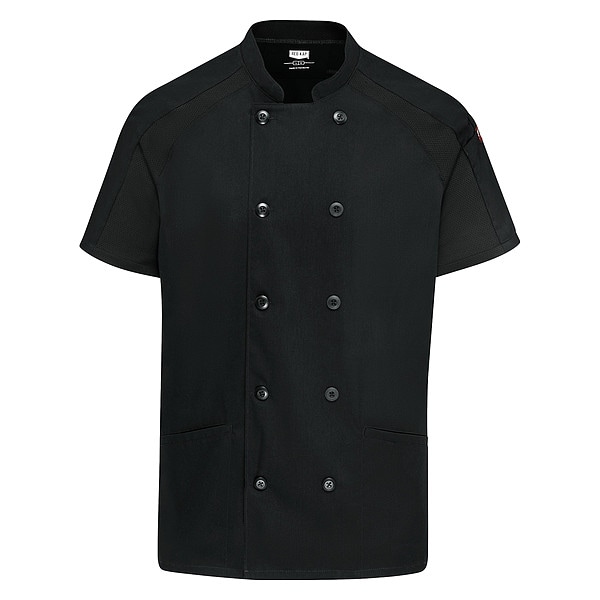 Chef Coat, Sleeve Length Short Sleeve, Size M, Resistance Properties Oil Resistant, Fabric Blend 100 Percent Polyester (Flex Panel); 65 Percent Polyester/35 Percent Cotton (Body), Color Black, Closure Button, Material Polyester (Flex Panel); Polyester/Cotton (Body)