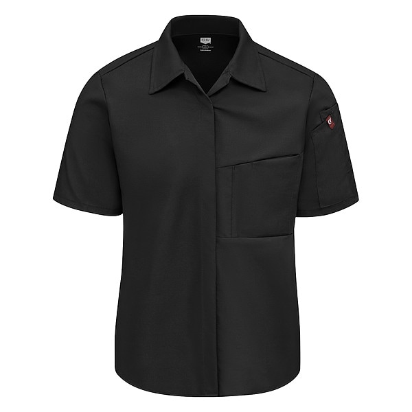 Kitchen Shirt, Sleeve Length Short Sleeve, Size M, Color Black, Features Breathable Mesh, Industrial Laundry Friendly, Fabric Blend 100 Percent Polyester (Mesh Back); 65 Percent Polyester/35 Percent Cotton (Body), Number of Pockets 3, Gender Women's, Material Polyester (Mesh Back); Polyester/Cotton (Body), Includes Dual Utensil/Thermometer Pocket, Pencil Holder, Closure Snap