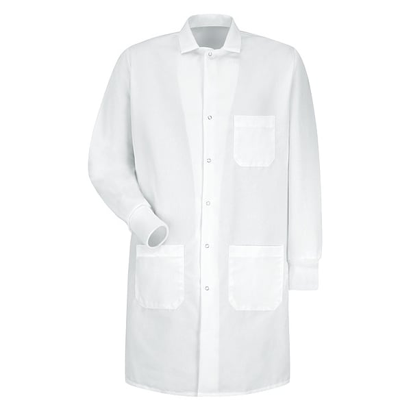 Lab Coat, Anti-Static No, Attached Hood No, Chest Size - Maximum 46 in, Clean Process Status Not Clean Processed, Closure Type Snaps, Collar Style Notched Lapel, Color White, Cuff Style Elastic Knit, Features Industrial Wash, Meant to be Worn Over Clothes, No Side Vent Openings, Gender Unisex, Hazard Type Non-Hazardous Dry Particulates, Non-Hazardous Liquids, Launderable Yes, Liquid Dispersal Type Splash, Spray, Material Cotton Poplin/Polyester, Material Weight 5 oz, Named Size L