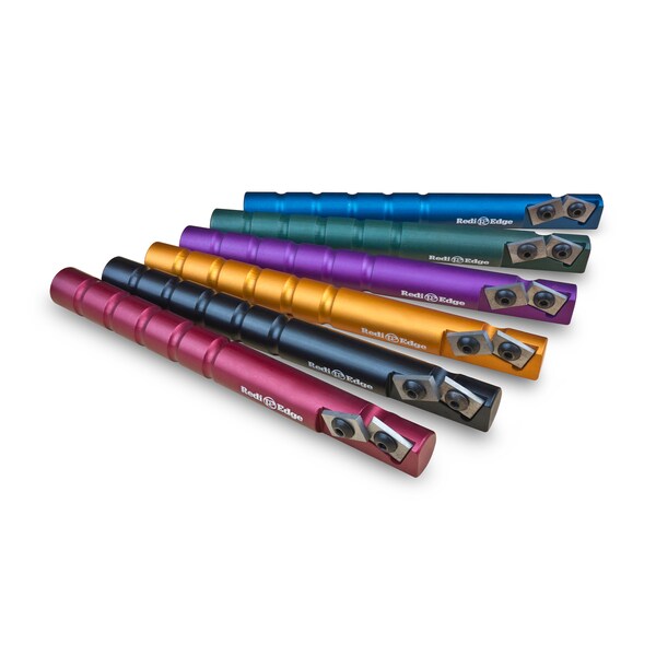 The REO198 Redi-Edge Original Knife Sharpener is great for virtually all knife sharpening needs both indoors and out. Ribbed housing provides for good grip-ability even when wet. Stick-type design is machined from military-grade aluminum bar stock for extreme durability, long life, and is lightweight. Great for keeping culinary, craft, work or other type knives sharp. The Duromite sharpening elements are harder than any knife blade and factory pre-set to sharpen most knife blades at a 40 degree inclusive angle to maintain a 20 degree double cutting edge. The Original Knife Sharpener comes with a ballistic black sheath.