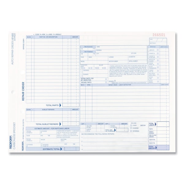 Auto Repair Form,4 Part Carbonless,PK50, Package Quantity 50