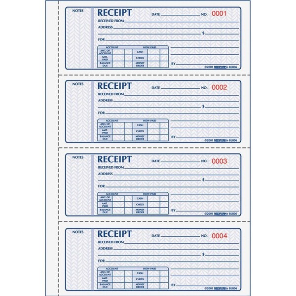 Manifold book with a flexible cover contains carbonless receipt forms that are consecutively numbered in red. Each page contains four two-part forms with the original in white and the duplicate in yellow. Duplicates feature black print. Security screen prevents alterations. Each form includes a place for date, payment amount, name of payer, payer's address, item description, and recipient name. A chart along the bottom breaks down the payment and includes boxes to fill in the amount of account, amount paid, balance due and payment method with preprinted boxes for cash, check and money order. Receipt book contains 400 sets.