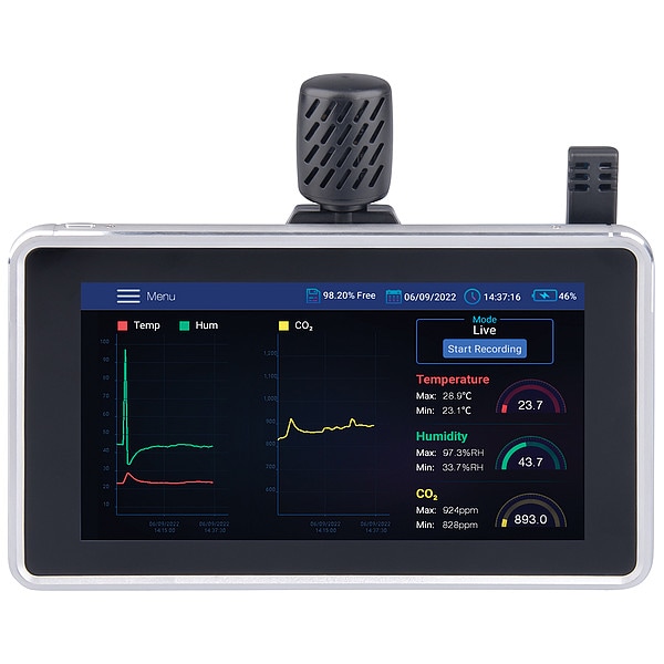 Indoor Air Quality Meter, Calibration Certificate Type Available Separately, Digital Display Screen Type LCD, Features Built-In Desk Stand and Wall Mounting Bracket, Internal Time and Date Stamp, Includes Power Adapter, USB Cable, Wall Mounting Bracket, Maximum Carbon Dioxide Measured 9,999 ppm, Maximum Carbon Monoxide Measured Not Applicable, Maximum Dew Point Measured Not Applicable, Maximum Oxygen Measured Not Applicable, Maximum Pressure Measured Not Applicable