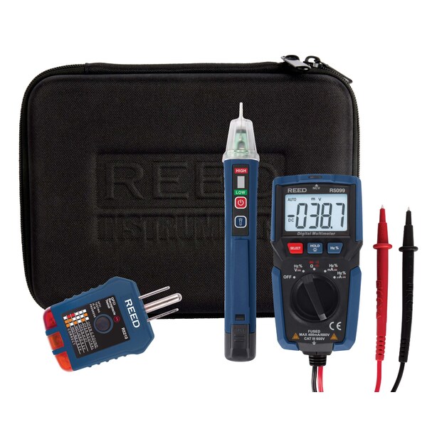 This electrical test kit includes the tools to troubleshoot common electrical problems. The R5099-KIT Electrical Test Kit includes a Compact Multimeter R5099, AC Voltage Detector R5100, Receptacle Tester R5210 and Carrying Case C-820 to keep your instruments protected and organized.