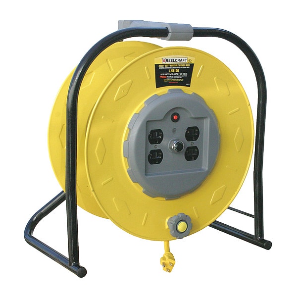 Hand Wind Cord Reel, Reel Capacity 100 ft of 10/3, Reel Color Yellow, Location Indoor, Reel Mounting Floor, Reel Material Steel, Temp. Rating 32 Degrees to 110 Degrees F, Overall Height 17 1/4 in, Overall Width 17 3/4 in, Overall Depth 11 1/8 in, Enclosed Reel No, Includes Carry Handle, Circuit Breaker, Standards CSA, UL