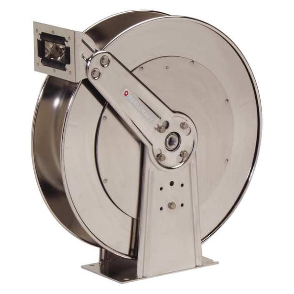 Spring Return Hose Reel, Air, Water, Maximum Operating Pressure 500 psi, Hose Capacity 50 ft (3/4 in I.D.), Drive Type Spring Return, Corrosion-Resistant Yes, Enclosed No, For Dual Hose No, Hose Reel Type Free Standing Hose Reel, Vehicle, Wall Mount Hose Reel, Includes Hose No, Mounting Location Ceiling, Floor, Wall, Pedestal Type Dual Pedestal, Number of Guide Arms Double Arm, Overall Height 25 3/8 in, Overall Length 24 in, Overall Width 10 1/2 in, Reel Material Stainless Steel