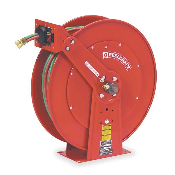 Welding Hose Reel, Welding, Hose Grade T, 200 psi, Hose Capacity 100 ft (1/4 in ID), Combination Type Fuel Gas, Mapp, Natural, Oxygen/Acetylene, Propane, Drive Type Spring Return, For Dual Hose Yes, Hose Reel Type Vehicle, Wall Mount Hose Reel, Hose Return Speed Control No, Includes Hose Yes, Hose 1 Color Red, Hose 1 Cover Material Rubber, Hose 1 Fitting A Gender Female, Hose 1 Fitting A Material Brass, Hose 1 Fitting A Size 9/16 in, Hose 1 Fitting A Type UNF, Hose 1 Fitting B Gender Female