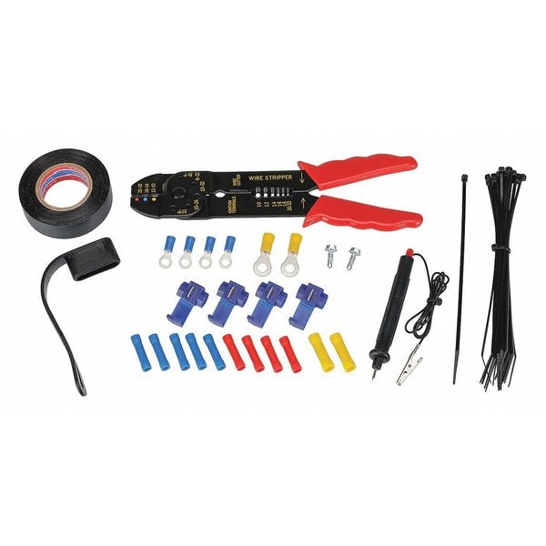 Kit Multipurpose Trailer Wiring, Product Type Kit Multipurpose Trailer Wiring, Connection Type Wire Lead, For Use With Trailers, Color Black, Material Brass, Copper, Polycarbonate, PVC, Wire Length 8 in, Diameter 2 1/4 in, Overall Length 60 in, Height 5 1/2 in, Overall Width 2 3/4 in, Standards SAE J1239,SAE J1128, Features 12V Probe Circuit Tester, Clear, Resealable Case, Multi-Purpose Cutting, Stripping and Crimping Wiring Tool