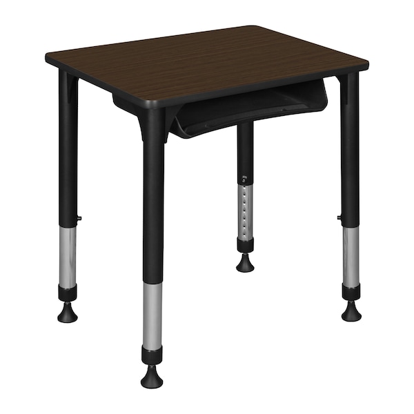 This Rectangle Height Adjustable School Desk with book storage is ideal for rooms with students of all ages. Kee adjustable post legs come four to a set and are height adjustable to accommodate students of all ages. Height is easy for adults to adjust by loosening and tightening a bolt with the included hex key. This 18.5-inch by 26-inch student desk assembles in a snap with just a few screws. The desktop is constructed of a thermal fused melamine Neo Walnut laminate tabletop that is 3/4-inch thick and finished with a black T-Mold edge band. Laminates are scratch, stain and scald resistant and wipe clean easily. Rounded corners make the table safer for everyone. The added Book Box helps keep student desks or tables clutter free. Conveniently store textbooks, supplies or other classroom materials underneath the work surface. Mounts to the underside of virtually any wood surface. Interior Dimensions: 17inW x 12.5inD x 3.5inH. Accommodates most commonly used notebooks, binders and textbooks. A sleek alternative to pedestal style bases, the adjustable post legs come in a classic black with chrome underneath. Adjustable glides on the bottom of the base ensure a level desktop and are easy to adjust.