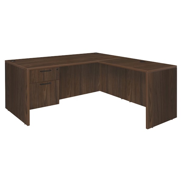 Versatility is just the beginning with so many Legacy desking options. This classic L-shaped corner desk is a great choice for professional and home offices alike. It comes with one box-file pedestal that has one box drawer and one file drawer that accepts both letter and legal filing. Both drawers lock and include ergonomically designed drawer pulls for convenience and ease in operation. Adjustable glides on the bottom of the base keep the desktop level and are easy to adjust. Wire management grommets keep cables clear of work areas. Finished in an stylish Neo Walnut laminate, this desk coordinates with other Legacy furniture. The Legacy collection is constructed of a 1-inch thick thermal fused melamine laminate with a 3-millimeter commercial grade matching PVC edge. Laminates are scratch, stain and scald resistant. Legacy casegoods are backed by a 10-year limited manufacturer's warranty.
