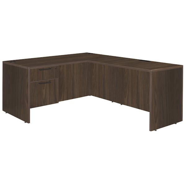 Versatility is just the beginning with so many Legacy desking options. This classic L-shaped corner desk is a great choice for professional and home offices alike. It comes with one box-file pedestal that has one box drawer and one file drawer that accepts both letter and legal filing. Both drawers lock and include ergonomically designed drawer pulls for convenience and ease in operation. Adjustable glides on the bottom of the base keep the desktop level and are easy to adjust. Wire management grommets keep cables clear of work areas. Finished in an stylish Neo Walnut laminate, this desk coordinates with other Legacy furniture. The Legacy collection is constructed of a 1-inch thick thermal fused melamine laminate with a 3-millimeter commercial grade matching PVC edge. Laminates are scratch, stain and scald resistant. Legacy casegoods are backed by a 10-year limited manufacturer's warranty.