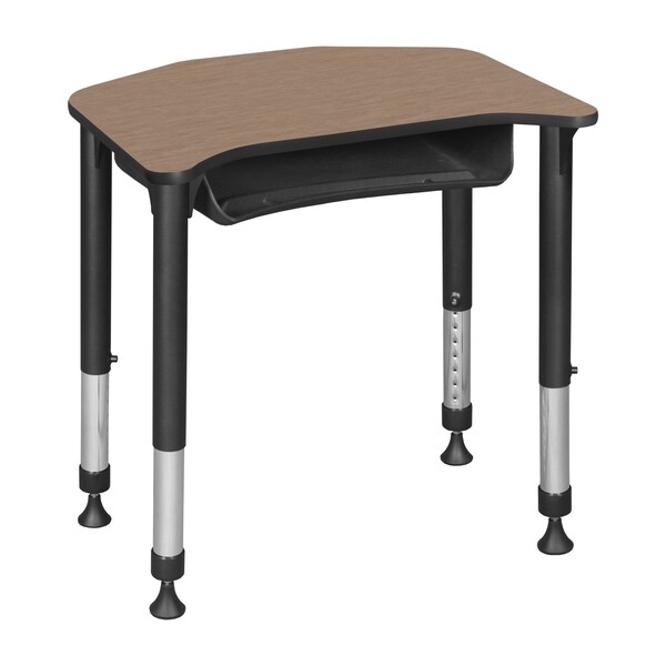 This Specialty Shaped Height Adjustable School Desk with book storage is ideal for rooms with students of all ages. Kee adjustable post legs come four to a set and are height adjustable to accommodate students of all ages. Height is easy for adults to adjust by loosening and tightening a bolt with the included hex key. This 26-inch by 24-inch student desk assembles in a snap with just a few screws. The desktop is constructed of a thermal fused melamine Noble Oak laminate tabletop that is 3/4-inch thick and finished with a black T-Mold edge band. Laminates are scratch, stain and scald resistant and wipe clean easily. Rounded corners make the table safer for everyone. The added Book Box helps keep student desks or tables clutter free. Conveniently store textbooks, supplies or other classroom materials underneath the work surface. Mounts to the underside of virtually any wood surface. Interior Dimensions: 17inW x 12.5inD x 3.5inH. Accommodates most commonly used notebooks, binders and textbooks. A sleek alternative to pedestal style bases, the adjustable post legs come in a classic black with chrome underneath. Adjustable glides on the bottom of the base ensure a level desktop and are easy to adjust.