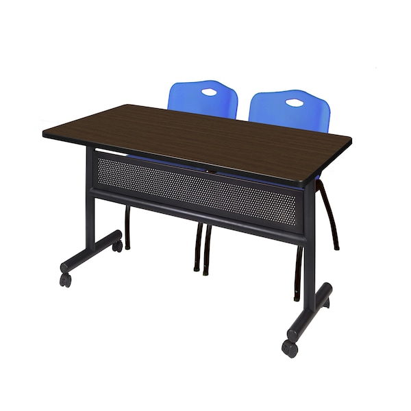 Set up a meeting room in a flash with Kobe Flip Top Tables. Unlock the quick-release lever and flip down the entire tabletop to nest together when not in use. Perfect for rooms with variable class size, the Flip Top tables save set up time and storage space. This set includes one 48in x 30in Flip Top table with Modesty Panel and two Blue inMin Stack Chairs. The table is constructed of a thermal fused melamine laminate tabletop that is 1-inch thick and finished with a black T-Mold edge band. This Neo Walnut tabletop is double-sided and finished in Noble Oak on the other side. Simply pick the side you like and install the base on the other. Self tapping wood screws and a placement template are included. Laminates are scratch, stain and scald resistant and wipe clean easily. Rounded corners make the table safer for everyone. The base is constructed of black tubular steel. Locking casters make these tables mobile and are ideal for computer labs, training rooms, classrooms and more. The sturdy, lightweight inMin stack chair by Regency offers durability, style and value. Its black metal frame and contoured plastic seat and back are strong and easy to clean. This versatile stack chair easily stores away in stacks of 12 and features a built in handle for easy mobility.