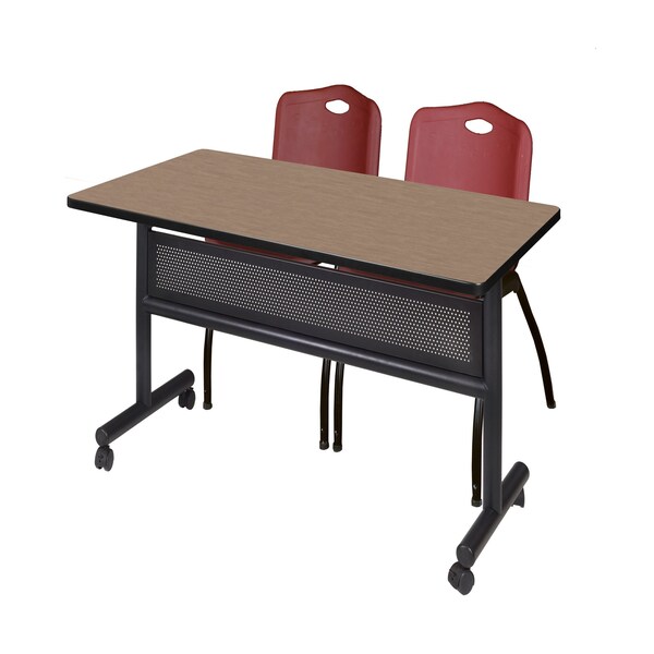 Set up a meeting room in a flash with Kobe Flip Top Tables. Unlock the quick-release lever and flip down the entire tabletop to nest together when not in use. Perfect for rooms with variable class size, the Flip Top tables save set up time and storage space. This set includes one 48in x 30in Flip Top table with Modesty Panel and two Burgundy inMin Stack Chairs. The table is constructed of a thermal fused melamine laminate tabletop that is 1-inch thick and finished with a black T-Mold edge band. This Noble Oak tabletop is double-sided and finished in Neo Walnut on the other side. Simply pick the side you like and install the base on the other. Self tapping wood screws and a placement template are included. Laminates are scratch, stain and scald resistant and wipe clean easily. Rounded corners make the table safer for everyone. The base is constructed of black tubular steel. Locking casters make these tables mobile and are ideal for computer labs, training rooms, classrooms and more. The sturdy, lightweight inMin stack chair by Regency offers durability, style and value. Its black metal frame and contoured plastic seat and back are strong and easy to clean. This versatile stack chair easily stores away in stacks of 12 and features a built in handle for easy mobility.