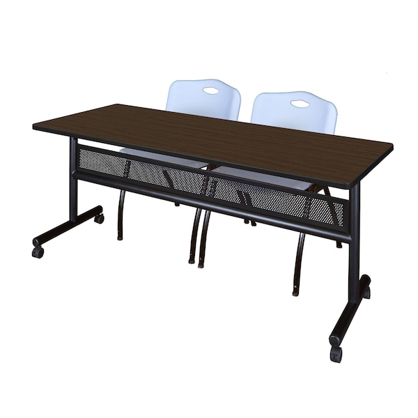 Set up a meeting room in a flash with Kobe Flip Top Tables. Unlock the quick-release lever and flip down the entire tabletop to nest together when not in use. Perfect for rooms with variable class size, the Flip Top tables save set up time and storage space. This set includes one 72in x 24in Flip Top table with Modesty Panel and two Grey inMin Stack Chairs. The table is constructed of a thermal fused melamine laminate tabletop that is 1-inch thick and finished with a black T-Mold edge band. This Neo Walnut tabletop is double-sided and finished in Noble Oak on the other side. Simply pick the side you like and install the base on the other. Self tapping wood screws and a placement template are included. Laminates are scratch, stain and scald resistant and wipe clean easily. Rounded corners make the table safer for everyone. The base is constructed of black tubular steel. Locking casters make these tables mobile and are ideal for computer labs, training rooms, classrooms and more. The sturdy, lightweight inMin stack chair by Regency offers durability, style and value. Its black metal frame and contoured plastic seat and back are strong and easy to clean. This versatile stack chair easily stores away in stacks of 12 and features a built in handle for easy mobility.