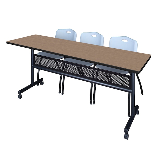 Set up a meeting room in a flash with Kobe Flip Top Tables. Unlock the quick-release lever and flip down the entire tabletop to nest together when not in use. Perfect for rooms with variable class size, the Flip Top tables save set up time and storage space. This set includes one 84in x 24in Flip Top table with Modesty Panel and three Grey inMin Stack Chairs. The table is constructed of a thermal fused melamine laminate tabletop that is 1-inch thick and finished with a black T-Mold edge band. This Noble Oak tabletop is double-sided and finished in Neo Walnut on the other side. Simply pick the side you like and install the base on the other. Self tapping wood screws and a placement template are included. Laminates are scratch, stain and scald resistant and wipe clean easily. Rounded corners make the table safer for everyone. The base is constructed of black tubular steel. Locking casters make these tables mobile and are ideal for computer labs, training rooms, classrooms and more. The sturdy, lightweight inMin stack chair by Regency offers durability, style and value. Its black metal frame and contoured plastic seat and back are strong and easy to clean. This versatile stack chair easily stores away in stacks of 12 and features a built in handle for easy mobility.