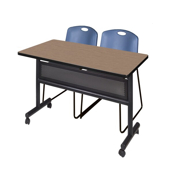 Set up a meeting room in a flash with Kobe Flip Top Tables. Unlock the quick-release lever and flip down the entire tabletop to nest together when not in use. Perfect for rooms with variable class size, the Flip Top tables save set up time and storage space. This set includes one 48in x 30in Flip Top table with Modesty Panel and two Blue Zeng Stack Chairs. The table is constructed of a thermal fused melamine laminate tabletop that is 1-inch thick and finished with a black T-Mold edge band. This Noble Oak tabletop is double-sided and finished in Neo Walnut on the other side. Simply pick the side you like and install the base on the other. Self tapping wood screws and a placement template are included. Laminates are scratch, stain and scald resistant and wipe clean easily. Rounded corners make the table safer for everyone. The base is constructed of black tubular steel. Locking casters make these tables mobile and are ideal for computer labs, training rooms, classrooms and more. Regency's Patent-Pending Zeng stack chair is not only unique, but durable, sturdy and versatile as well. The Zeng seat and back are treated with an anti-microbial agent, which makes it perfect for schools, waiting rooms, cafeterias and more. A reinforced black metal frame is designed to support up to 400lbs and a built in handle makes moving the chair easier.