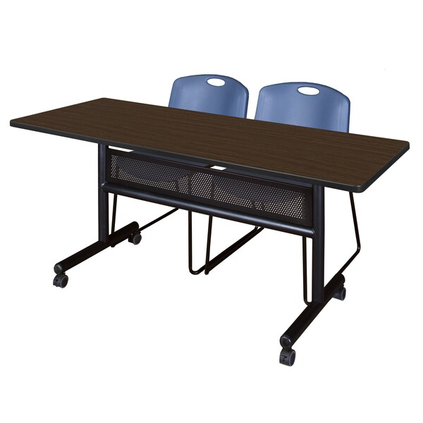 Set up a meeting room in a flash with Kobe Flip Top Tables. Unlock the quick-release lever and flip down the entire tabletop to nest together when not in use. Perfect for rooms with variable class size, the Flip Top tables save set up time and storage space. This set includes one 60in x 24in Flip Top table with Modesty Panel and two Blue Zeng Stack Chairs. The table is constructed of a thermal fused melamine laminate tabletop that is 1-inch thick and finished with a black T-Mold edge band. This Neo Walnut tabletop is double-sided and finished in Noble Oak on the other side. Simply pick the side you like and install the base on the other. Self tapping wood screws and a placement template are included. Laminates are scratch, stain and scald resistant and wipe clean easily. Rounded corners make the table safer for everyone. The base is constructed of black tubular steel. Locking casters make these tables mobile and are ideal for computer labs, training rooms, classrooms and more. Regency's Patent-Pending Zeng stack chair is not only unique, but durable, sturdy and versatile as well. The Zeng seat and back are treated with an anti-microbial agent, which makes it perfect for schools, waiting rooms, cafeterias and more. A reinforced black metal frame is designed to support up to 400lbs and a built in handle makes moving the chair easier.