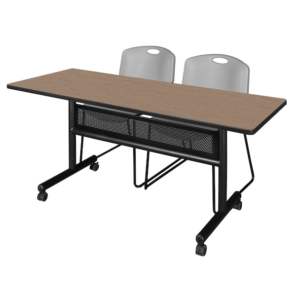 Set up a meeting room in a flash with Kobe Flip Top Tables. Unlock the quick-release lever and flip down the entire tabletop to nest together when not in use. Perfect for rooms with variable class size, the Flip Top tables save set up time and storage space. This set includes one 60in x 24in Flip Top table with Modesty Panel and two Grey Zeng Stack Chairs. The table is constructed of a thermal fused melamine laminate tabletop that is 1-inch thick and finished with a black T-Mold edge band. This Noble Oak tabletop is double-sided and finished in Neo Walnut on the other side. Simply pick the side you like and install the base on the other. Self tapping wood screws and a placement template are included. Laminates are scratch, stain and scald resistant and wipe clean easily. Rounded corners make the table safer for everyone. The base is constructed of black tubular steel. Locking casters make these tables mobile and are ideal for computer labs, training rooms, classrooms and more. Regency's Patent-Pending Zeng stack chair is not only unique, but durable, sturdy and versatile as well. The Zeng seat and back are treated with an anti-microbial agent, which makes it perfect for schools, waiting rooms, cafeterias and more. A reinforced black metal frame is designed to support up to 400lbs and a built in handle makes moving the chair easier.