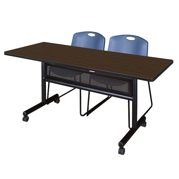 Set up a meeting room in a flash with Kobe Flip Top Tables. Unlock the quick-release lever and flip down the entire tabletop to nest together when not in use. Perfect for rooms with variable class size, the Flip Top tables save set up time and storage space. This set includes one 60in x 30in Flip Top table with Modesty Panel and two Blue Zeng Stack Chairs. The table is constructed of a thermal fused melamine laminate tabletop that is 1-inch thick and finished with a black T-Mold edge band. This Neo Walnut tabletop is double-sided and finished in Noble Oak on the other side. Simply pick the side you like and install the base on the other. Self tapping wood screws and a placement template are included. Laminates are scratch, stain and scald resistant and wipe clean easily. Rounded corners make the table safer for everyone. The base is constructed of black tubular steel. Locking casters make these tables mobile and are ideal for computer labs, training rooms, classrooms and more. Regency's Patent-Pending Zeng stack chair is not only unique, but durable, sturdy and versatile as well. The Zeng seat and back are treated with an anti-microbial agent, which makes it perfect for schools, waiting rooms, cafeterias and more. A reinforced black metal frame is designed to support up to 400lbs and a built in handle makes moving the chair easier.