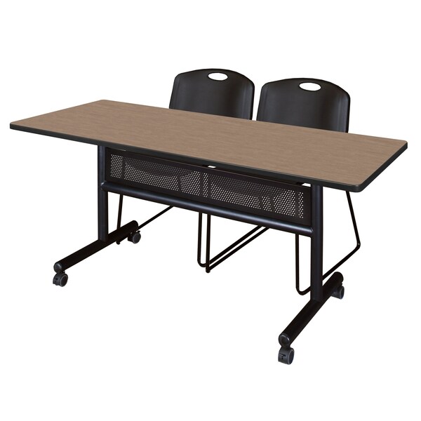 Set up a meeting room in a flash with Kobe Flip Top Tables. Unlock the quick-release lever and flip down the entire tabletop to nest together when not in use. Perfect for rooms with variable class size, the Flip Top tables save set up time and storage space. This set includes one 60in x 30in Flip Top table with Modesty Panel and two Black Zeng Stack Chairs. The table is constructed of a thermal fused melamine laminate tabletop that is 1-inch thick and finished with a black T-Mold edge band. This Noble Oak tabletop is double-sided and finished in Neo Walnut on the other side. Simply pick the side you like and install the base on the other. Self tapping wood screws and a placement template are included. Laminates are scratch, stain and scald resistant and wipe clean easily. Rounded corners make the table safer for everyone. The base is constructed of black tubular steel. Locking casters make these tables mobile and are ideal for computer labs, training rooms, classrooms and more. Regency's Patent-Pending Zeng stack chair is not only unique, but durable, sturdy and versatile as well. The Zeng seat and back are treated with an anti-microbial agent, which makes it perfect for schools, waiting rooms, cafeterias and more. A reinforced black metal frame is designed to support up to 400lbs and a built in handle makes moving the chair easier.