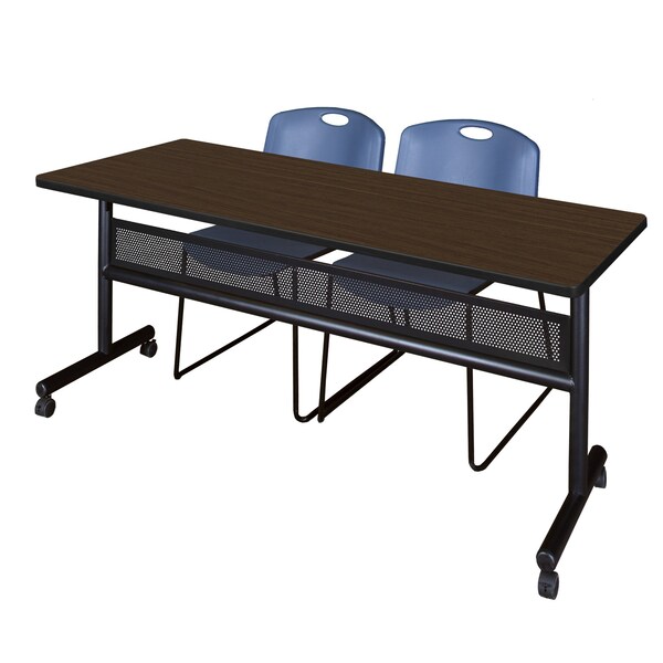 Set up a meeting room in a flash with Kobe Flip Top Tables. Unlock the quick-release lever and flip down the entire tabletop to nest together when not in use. Perfect for rooms with variable class size, the Flip Top tables save set up time and storage space. This set includes one 72in x 30in Flip Top table with Modesty Panel and two Blue Zeng Stack Chairs. The table is constructed of a thermal fused melamine laminate tabletop that is 1-inch thick and finished with a black T-Mold edge band. This Neo Walnut tabletop is double-sided and finished in Noble Oak on the other side. Simply pick the side you like and install the base on the other. Self tapping wood screws and a placement template are included. Laminates are scratch, stain and scald resistant and wipe clean easily. Rounded corners make the table safer for everyone. The base is constructed of black tubular steel. Locking casters make these tables mobile and are ideal for computer labs, training rooms, classrooms and more. Regency's Patent-Pending Zeng stack chair is not only unique, but durable, sturdy and versatile as well. The Zeng seat and back are treated with an anti-microbial agent, which makes it perfect for schools, waiting rooms, cafeterias and more. A reinforced black metal frame is designed to support up to 400lbs and a built in handle makes moving the chair easier.