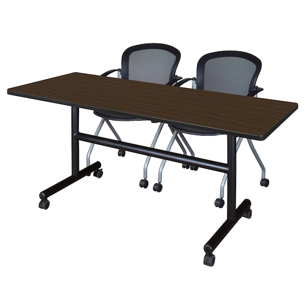 Set up a meeting room in a flash with Kobe Flip Top Tables. Unlock the quick-release lever and flip down the entire tabletop to nest together when not in use. Perfect for rooms with variable class size, the Flip Top tables save set up time and storage space. This set includes one 60in x 30in Flip Top table and two Cadence Nesting Chairs. The table is constructed of a thermal fused melamine laminate tabletop that is 1-inch thick and finished with a black T-Mold edge band. This Neo Walnut tabletop is double-sided and finished in Noble Oak on the other side. Simply pick the side you like and install the base on the other. Self tapping wood screws and a placement template are included. Laminates are scratch, stain and scald resistant and wipe clean easily. Rounded corners make the table safer for everyone. The base is constructed of black tubular steel. Locking casters make these tables mobile and are ideal for computer labs, training rooms, classrooms and more. Cadence nesting chairs can take you anywhere. A breathable mesh back conforms to users' needs and the seat flips up to provide a unique nesting option. The stylish silver base features four casters for easy mobility and the seat is upholstered with a lasting black fabric.
