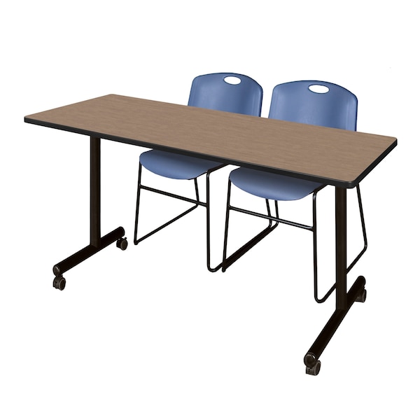 Kobe Mobile T-Base Training Table W/ 2 Zeng Stack Chairs, 66 in W, 24 in L, Noble Oak