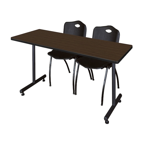 Kobe T-Base Training Seminar Table W/ 2 M Stack Chairs, 66 in W, 30 in L, Neo Walnut