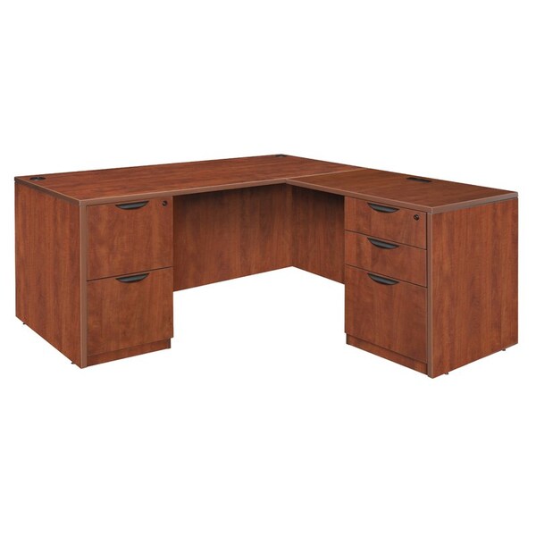Versatility is just the beginning with so many Legacy desking options. This classic L-shaped corner desk is a great choice for professional and home offices alike. It comes with one box-box-file pedestal and one file-file pedestal. All file drawers accept letter and legal filing while box drawers keep supplies handy. All drawers lock and include ergonomically designed drawer pulls for convenience and ease in operation. Adjustable glides on the bottom of the base keep the desktop level and are easy to adjust. Wire management grommets keep cables clear of work areas. Finished in an stylish Cherry laminate, this desk coordinates with other Legacy furniture. The Legacy collection is constructed of a 1-inch thick thermal fused melamine laminate with a 3-millimeter commercial grade matching PVC edge. Laminates are scratch, stain and scald resistant. Legacy casegoods are backed by a 10-year limited manufacturer's warranty.