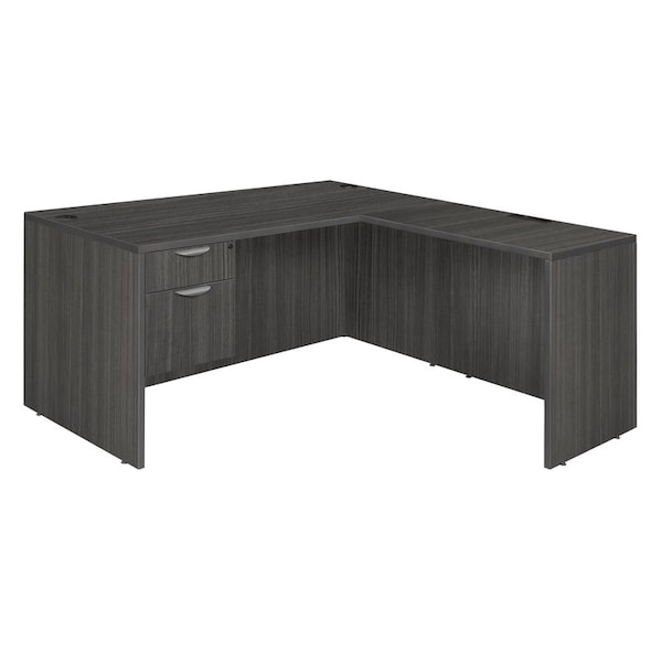 Versatility is just the beginning with so many Legacy desking options. This classic L-shaped corner desk is a great choice for professional and home offices alike. It comes with one box-file pedestal that has one box drawer and one file drawer that accepts both letter and legal filing. Both drawers lock and include ergonomically designed drawer pulls for convenience and ease in operation. Adjustable glides on the bottom of the base keep the desktop level and are easy to adjust. Wire management grommets keep cables clear of work areas. Finished in an stylish Ash Grey laminate, this desk coordinates with other Legacy furniture. The Legacy collection is constructed of a 1-inch thick thermal fused melamine laminate with a 3-millimeter commercial grade matching PVC edge. Laminates are scratch, stain and scald resistant.