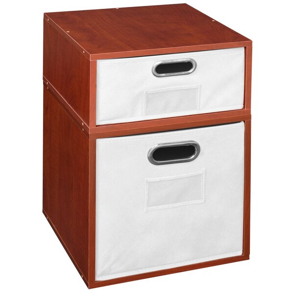 Let your creativity run wild with Cubo! This innovative set of 1 Full Size and 1 Half Size storage cubes by Niche are designed to fasten together in any direction! Connect them in any way you like. In a row, in a pyramid, in a U or L shape or countless other configurations. Cubes connect to one another with spring pins, making it easy to customize and create a storage system just for you with a single cube to a set of 12 or more. Niche storage cubes are actually cubes! They can be used in any direction. There's no "right" way to use them because all sides measure the same! Who ever said all cubes had to face the front like a bookcase? Cubo storage cubes can attach together in any direction, which opens up a myriad of new design possibilities. Turn one to the right, turn another to the left. Keep one facing front and still another facing the back. Perfect to clean up clutter in closets, entryways, laundry & storage rooms, as a bookcase, nightstand or media storage, in a classroom or children's room-these cubes fit anywhere! Its rich Cherry finish shows subtle wood grain and is sure to please and coordinates with the rest of the Niche line. No tools LockDowel assembly allows pieces to simply snap together and lock into place for a sturdy, hassle-free build in less than 2 minutes. No more searching for the right size screwdriver or dropping tiny screws. Just snap into place and go. Less hardware and fewer small parts means less plastic packaging and less waste. Arrange and rearrange the White Foldable Fabric Bins for a fresh, new custom look whenever you like!