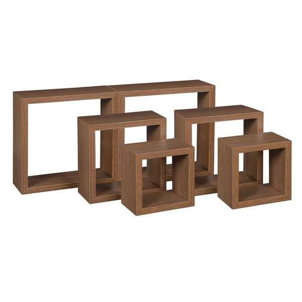 Have the best of both worlds with Niche's Soho Collection. Combine the modern elegance of cube storage with the charm of a rustic woodgrain surface. This Wall Shelf Set includes 6 shelves at 3 different sizes to create a unique look to any space! The largest wall shelf measures overall 10"W x 10"H x 4" D, the medium is 8"W x 8"H x 4"D & the smallest shelf is 6" W x 6"H, 4" D. Easy to assemble and easy to hang, these shelves are the perfect addition to any bedroom, home office, entryway, childrens room & more! Each shelf hangs like a picture frame from a wall screw on each side, which keeps the shelf flush against the wall and provides stability. Use this six piece wall shelf set as additional storage space or to display belongings. Its attractive Urban Walnut finish is sure to please and match any decor style!