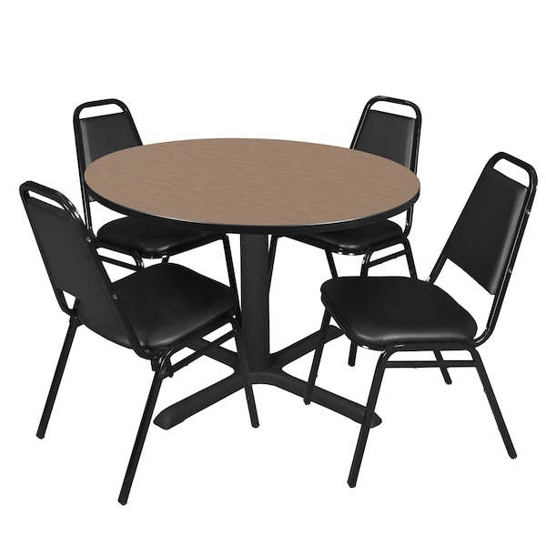 Round Cain Breakroom Table W/ 4 Restaurant Stack Chairs, 48 in W, 48 in L, Noble Oak