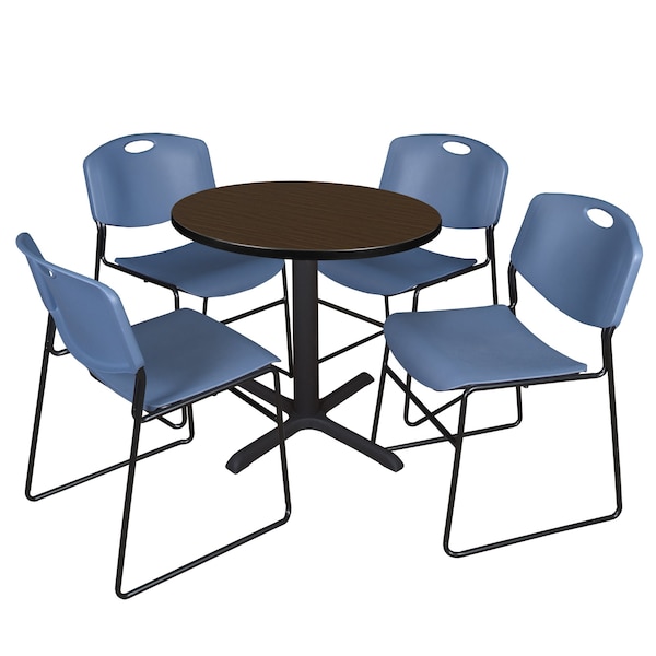 Whether you're planning a lounge, cafe, library, breakroom or restaurant, let the Cain Collection take you there. These versatile tables are at home in stylish cafe or coffee shop settings as well as lunch rooms. This set includes one 30-inch round Cain table and four Blue Zeng Stack Chairs. The table is constructed of a thermal fused melamine laminate tabletop that is 1-inch thick and finished with a black T-Mold edge band. This Neo Walnut Tabletop is double-sided and finished in Noble Oak on the other side. Rounded corners make the table safer for everyone. Simply pick the side you like and install the base on the other. Self tapping wood screws and a placement template are included. Laminates are scratch, stain and scald resistant and wipe clean easily. The stylish X-Base is constructed of a tubular steel post and solid steel X-Base. Hidden adjustable glides keep the tabletop level and are easy to adjust. Regency's Patent-Pending Zeng stack chair is not only unique, but durable, sturdy and versatile as well. The Zeng seat and back are treated with an anti-microbial agent, which makes it perfect for schools, waiting rooms, cafeterias and more. A reinforced black metal frame is designed to support up to 400lbs and a built in handle makes moving the chair easier.
