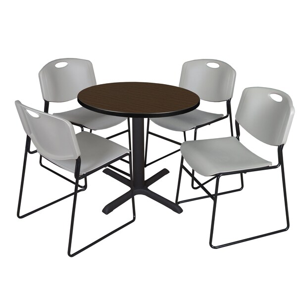 Whether you're planning a lounge, cafe, library, breakroom or restaurant, let the Cain Collection take you there. These versatile tables are at home in stylish cafe or coffee shop settings as well as lunch rooms. This set includes one 30-inch round Cain table and four Grey Zeng Stack Chairs. The table is constructed of a thermal fused melamine laminate tabletop that is 1-inch thick and finished with a black T-Mold edge band. This Neo Walnut Tabletop is double-sided and finished in Noble Oak on the other side. Rounded corners make the table safer for everyone. Simply pick the side you like and install the base on the other. Self tapping wood screws and a placement template are included. Laminates are scratch, stain and scald resistant and wipe clean easily. The stylish X-Base is constructed of a tubular steel post and solid steel X-Base. Hidden adjustable glides keep the tabletop level and are easy to adjust. Regency's Patent-Pending Zeng stack chair is not only unique, but durable, sturdy and versatile as well. The Zeng seat and back are treated with an anti-microbial agent, which makes it perfect for schools, waiting rooms, cafeterias and more. A reinforced black metal frame is designed to support up to 400lbs and a built in handle makes moving the chair easier.