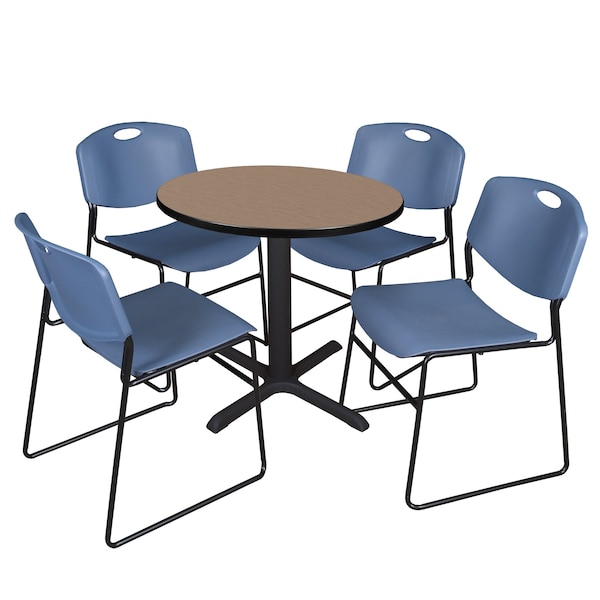 Round Cain Breakroom Table W/ 4 Zeng Stack Chairs, 30 in W, 30 in L, Noble Oak