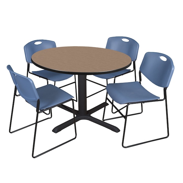 Round Cain Breakroom Table W/ 4 Zeng Stack Chairs, 48 in W, 48 in L, Noble Oak