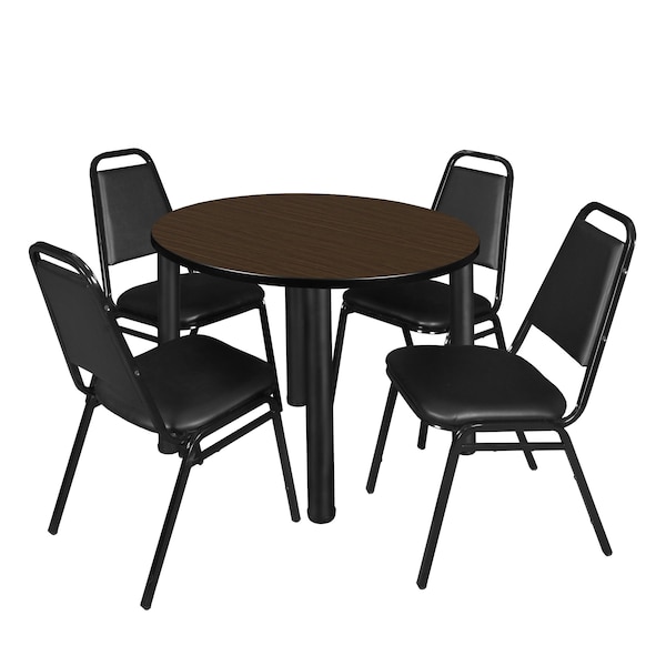 Round Kee Breakroom Table W/ 4 Restaurant Stack Chairs, 36 in W, 36 in L, Neo Walnut