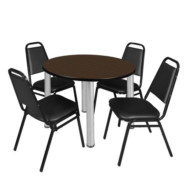 Round Kee Breakroom Table W/ 4 Restaurant Stack Chairs, 36 in W, 36 in L, Neo Walnut