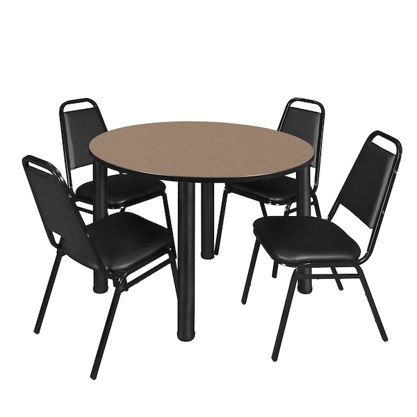 Round Kee Breakroom Table W/ 4 Restaurant Stack Chairs, 48 in W, 48 in L, Noble Oak
