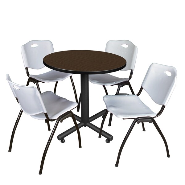 Round Kobe Breakroom Table W/ 4 M Stack Chairs, 30 in W, 30 in L, Neo Walnut