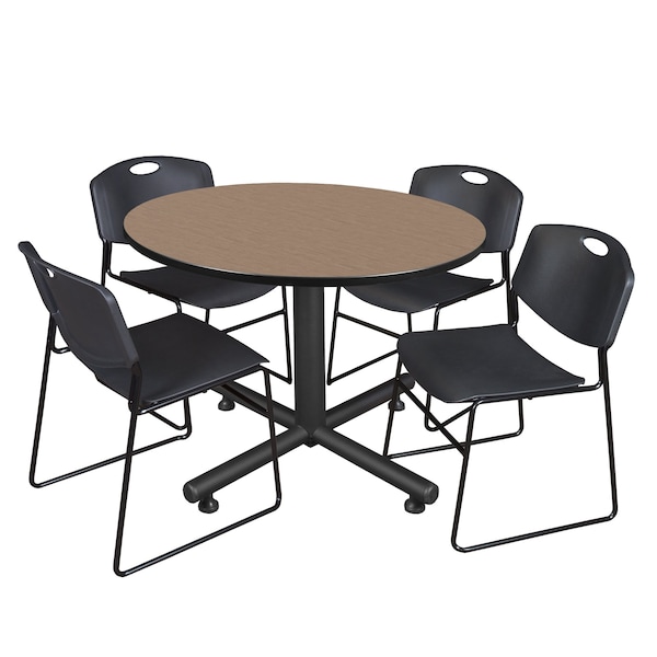 Round Kobe Breakroom Table W/ 4 Zeng Stack Chairs, 48 in W, 48 in L, Noble Oak
