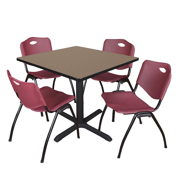 - Versatile table & chair set includes one 36-inch square Cain table and 4 Burgundy "M" Stack Chairs